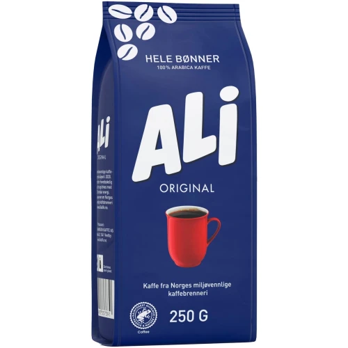 ALI Kaffe original har en perfekt balanse mellom god fylde, fin aroma og lett syrlighet som gir den gode smaken som kjennetegner ALI Kaffe. ALI Kaffe original består av 100% Arabica-bønner fra Brasil og Colombia som dyrkes på 1.000 – 1.600 meters høyde, hvor det er perfekt jordsmonn og klima for kaffedyrking. Ved å kombinere kaffebønner fra de to landene får en fram en perfekt balanse mellom god fylde, fin aroma og lett syrlighet som gir den gode smaken som kjennetegner ALI Kaffe. - Malingsgrad: Hele bønner. - Volum: 250g.